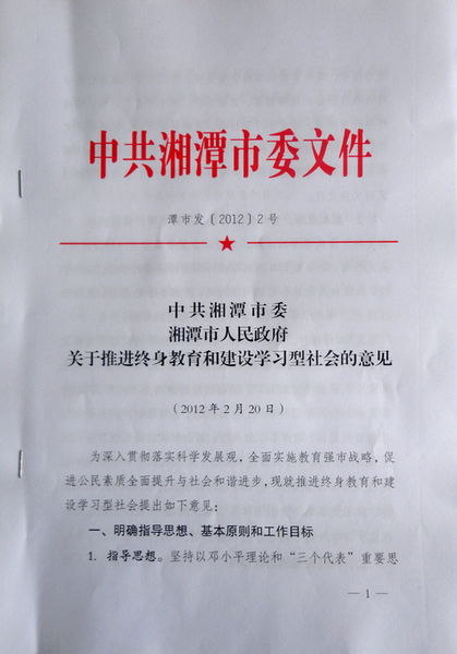 近日,湘潭市委、市政府印发《关于推进的意见》潭市发[2012]2号文件。此纲领性文件明确指出:各级政府要高度重视推进终身教育和建设学习型社会工作,切实加强领导,将其列入各级政府和各部门的重要议事日程。成立湘潭市推进终身教育和建设学习型社会工作领导小组,领导小组办公室设在教育局,由湘潭广播电视大学具体负责,全面推进终身教育和建设学习型社会工作。建立以政府投入为主,多渠道筹集推进终身教育经费的保障机制。根据经济发展水平,市政府每年安排推进终身教育和建设学习型社会的专项经费,并根据经济社会的发展水平,逐年递增。鼓励企事业单位和其他社会组织支持推进终身教育和建设学习型社会工作,鼓励家庭及个人增加学习投入。这些重大举措给湘潭市推进终身教育和建设学习型社会指明了方向,湘潭市终身教育和学习型社会建设迎来重大发展机遇。
