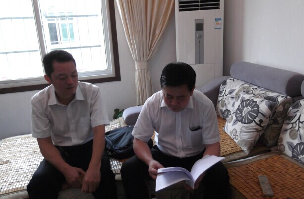 校长伍浩和校长助理曾建国一起翻阅烈士学员生前先进事迹报道