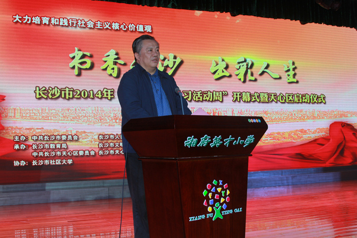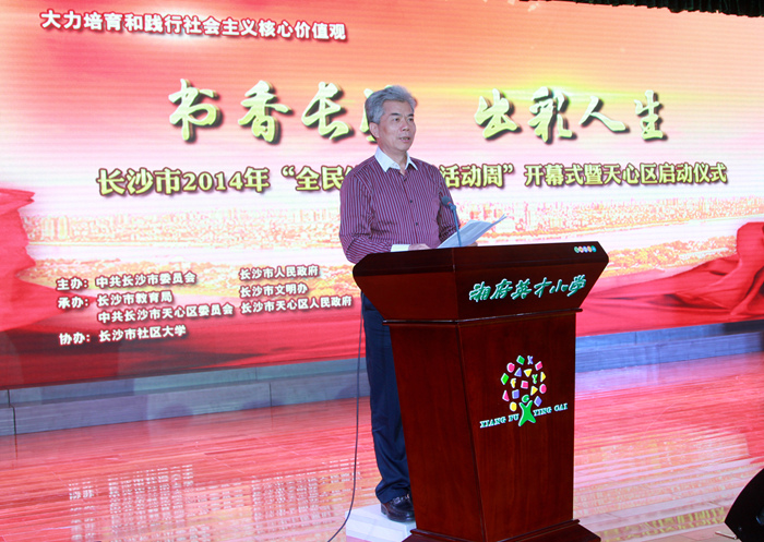 10月22日,以“书香长沙 出彩人生”为主题的2014年长沙市全民终身学习活动周开幕式在天心区湘府英才小学举行。省终身教育促进会会长唐之享宣布活动正式启动,启动仪式由市人民政府副秘书长刘秋成主持。