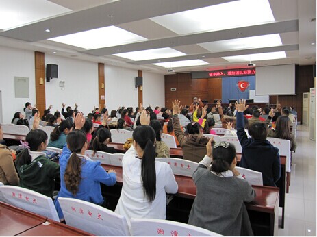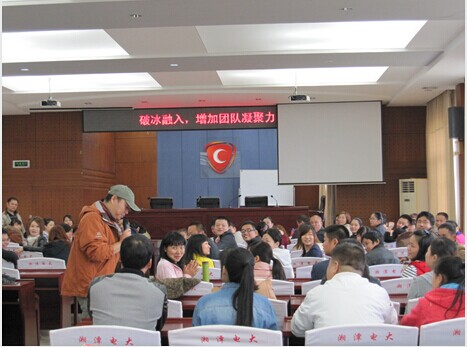 2014年11月2日,秋高气爽,为了增进电大学员之间以及师生之间的沟通交流,促进团队文化建设,湘潭电大开放教育学院组织师生在实训楼六楼会议室,开展了“破冰融入,增强凝聚力” 的主题活动。活动得到了师生的积极响应,参加活动的人员达180多人。“破冰融入”培训师,湖南科技大学教育学硕士、彭光辉教授富有激情讲授和引导,带领同学们进行了破冰导入、盲人报数、驿站传书、突破亚马逊等活动项目。活动中高潮迭起,把同学们从散漫的互相陌生状态,带入互相关注、互相关心、互相熟悉,互相鼓励的团结、协作的氛围。在活动开展过程中,各组同学为项目方案积极探讨,献计献策,互相配合。大家为每一次的成功欢欣鼓舞,为每一次的失败扼腕叹息。通过活动让大家认识到团队默契配合的力量,思考总结的重要,协同合作的奇迹。