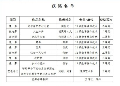 在湖南省第四届大学生艺术展演活动中,我院传媒艺术系师生共获艺术作品二等奖3个(摄影类1个,微电影类2个);三等奖5个(摄影类4个,微电影类1个);艺术教育科研论文三等奖1个;评选优秀指导教师2名。