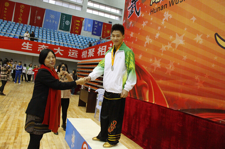 长沙师范学院的石维纪在学院组男子传统长器械和男子刀术两个项目上都夺得了金牌。有着丰富比赛经验的他,对本届大运会的比赛是胸有成竹。然而,拿到奖牌后的他在接受采访时表示内心还是很激动。他说,应该多参加比赛,多看多学。平时的训练很苦,是为了这个比赛他才一直坚持到现在。今天的成绩离不开教练的教导和栽培。