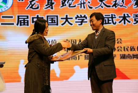12月14日,第二届“龙神蛇形太极拳杯”中国大学生武术竞艺大赛在我校举行,来自全国13所高校的近200名大学生上演了一场结合武术和艺术精髓的武术盛宴。国家教育部体卫艺司司长刘培俊,湖南省教育厅副厅长邹文辉,国务院学部委员王家宏等领导出席并观看了比赛。