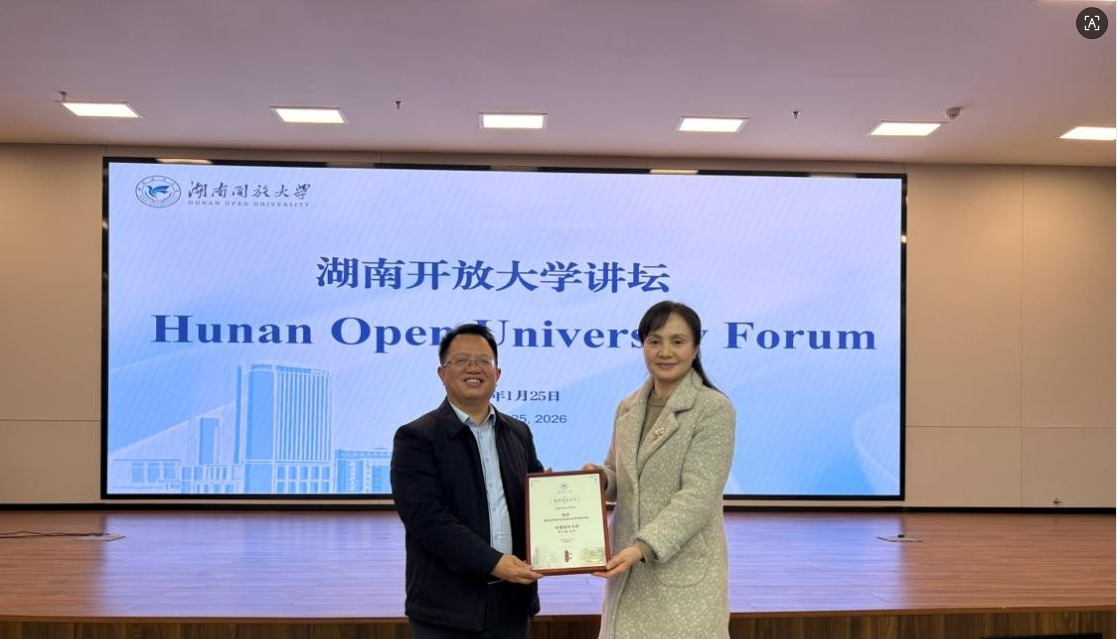 钟金霞为李小球颁发湖南开放大学讲坛专家纪念证