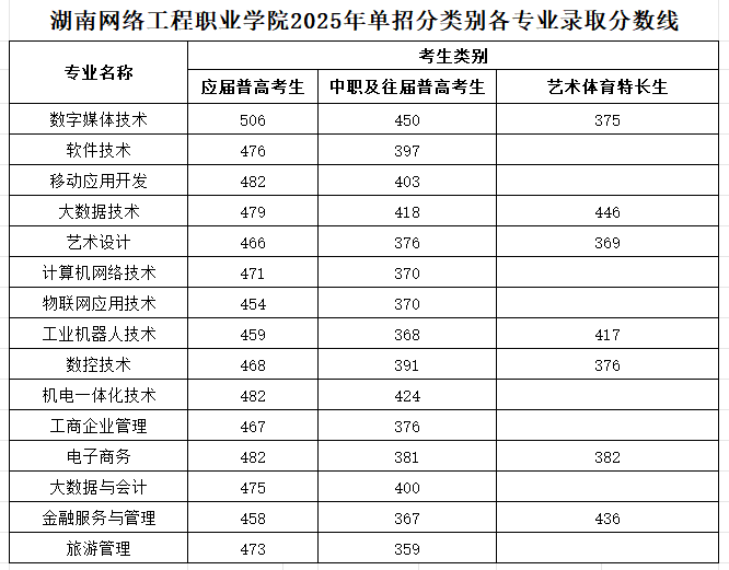 依据《湖南省教育厅关于做好2025年高职(高专)院校单独招生工作的通知》(湘教通[2024]271号)精神和 《湖南网络工程职业学院2025年单独招生章程》(以下简称《章程》),现将2025年单独招生录取分数线和名单公示如下: