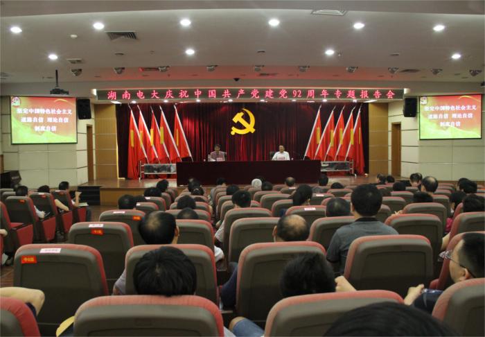 7月1日下午,我校在远程教育大楼负一楼报告厅举行专题报告会,学习党的十八大精神,增强“三个自信”,热烈庆祝中国共产党建党92周年。报告会由学校党委书记陈建民主持,湖南师范大学校长刘湘溶教授受邀在会上作题为“谈谈中国的发展”的报告。校领导周宇、刘建军、杨建伟、彭思毛、黎定军、汤筱飞、欧俊、高宁,老校长杜纯梓出席报告会。学校全体教职工党员、入党积极分子和非党员副处级以上干部参加了报告会。