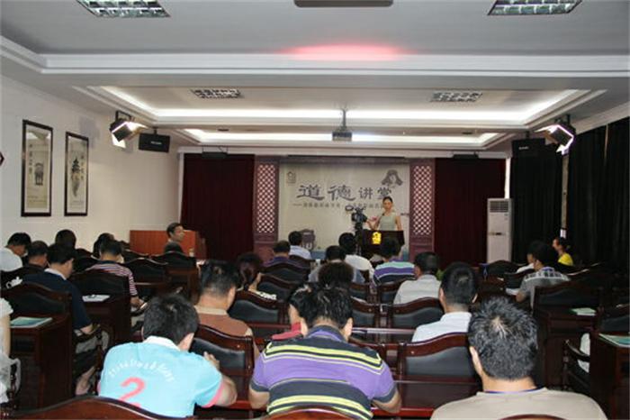 首期道德讲堂的主题是奉献。活动由“做反省、唱歌曲、学模范、颂经典、发善心、送吉祥”六个环节组成。首先,全体教职工抛开所有的紧张、烦恼和不安,以反省之心,反省不理智之念,不和谐之音不练达之美、不完美之事;随后,伴随着音乐,大家齐唱《爱的奉献》,领会歌曲中对爱的诠释和赞美;接着,全体教职工共同聆听了全国道德模范提名奖获得者沈国初的先进事迹。道德模范的亲身讲述让在座每个人的心灵上产生了很深的触动和感想。党委书记唐爱国表示,沈国初同志曾是我们电大的一名优秀学生,虽然只是一名普通警察,但他在平凡的岗位上干出了不平凡的业绩,在个人道德修养方面是我们前进的典范。我们要学习他爱岗敬业、无私奉献的崇高境界,学习他执法规范、服务热情的职业风范,学习他解危济困、助人为乐的优秀品格,学习他淡泊名利、舍小家为大家的高尚道德情操。随后,全体教职工在主持人的带领下集体诵读了《弟子规》中关于爱、关于德行教育选段,并现场做出道德承诺:我是一名电大老师,要做一个勤劳善良的人,一个文明有礼的人,一个乐于奉献的人。最后,在舒缓的音乐中,工作人员为全体教职工送上了吉祥物。