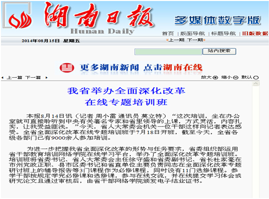 在省委组织部的领导下,在学校党委、行政的大力支持下,干部在线支持服务部在省干部教育培训网络平台举办了“全面深化改革专题培训班”。各市州(含县市区)、省委各部委、省直机关各单位、各人民团体、省属高校和事业单位的处级干部、省属企业中层以上管理人员等共9000余人参训。培训班于7月18日开班,8月18日结束,为期一个月。省委组织部举办培训班的目的是引导各级干部深入学习贯彻党的十八届三中全会精神,切实增强全面深化改革的思想和行动自觉,进一步把握我省全面深化改革的形势与任务要求,提高贯彻落实省委、省政府决策部署的能力。