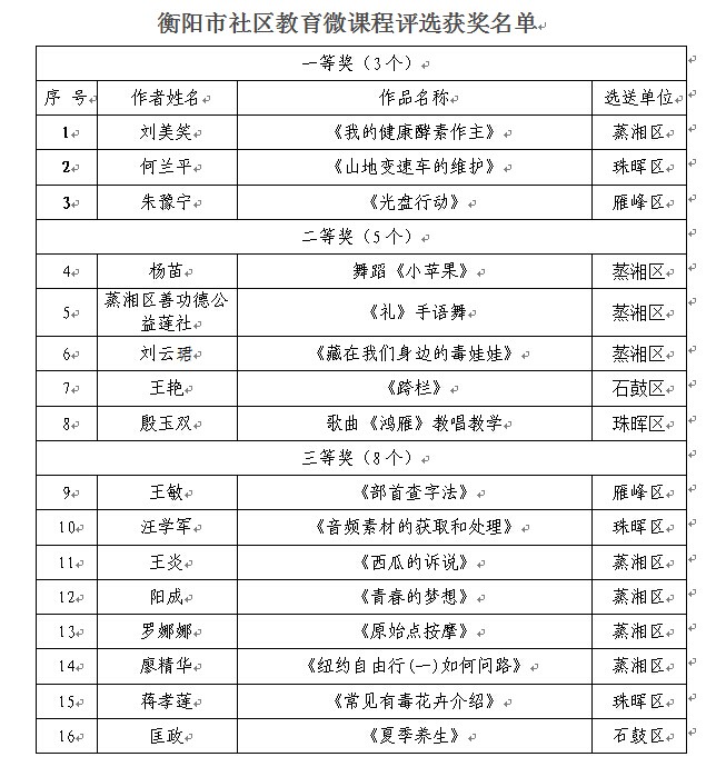 经过近3个月时间的培训、制作、评选,衡阳市社区教育微课程评选活动于8月中旬落下帷幕。8月15日,衡阳市社区大学会同市教育局组织专家对上报的微课程进行了评选,共评出一等奖3个,二等奖5个,三等奖8个(详情请见附件)。并向国家数字化学习资源中心推荐18件优秀作品参加全国社区教育优秀微课程评选。(衡阳电大 王静)