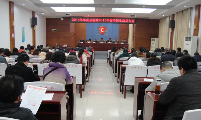2015年1月26日上午,湘潭电大2014年度年终工作总结暨2015年春季招生动员大会在学校实训楼六楼报告厅隆重召开。全体校领导及全校教职工130余人参加了会议。会议由副校长钱焕新主持。