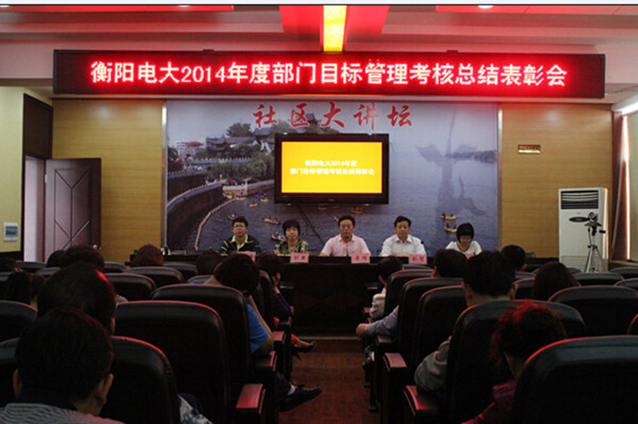 2015年4月3日,衡阳电大在北校区三楼会议室召开目标管理考核总结表彰会议。会议通报了2014年学校各部门目标管理考核情况,表彰先进,总结经验,安排部署2015年目标管理考核工作,动员全校上下进一步振奋精神、凝心聚力、扎实苦干,全力推动2015年各项工作取得新突破。会议由副校长肖海源主持,全体教职员工参会。