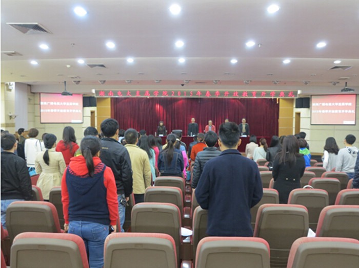 4月12日上午,直属学院在远教大楼负一楼报告厅举行2015年春季新生开学典礼。校长助理、教务处处长缪富民,开放教育文法教学部主任刘建宏、经管教学部主任苏晓凤、理工农医教学部主任杨先林及直属学院教职工及2015春新生出席了典礼。