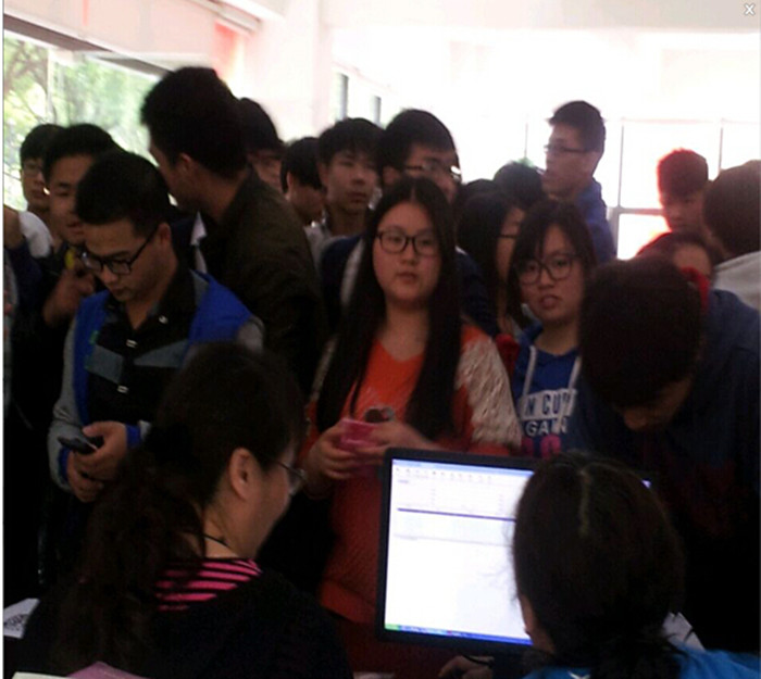 找书比赛快开始了,同学们边排队报名,边查看手中的图书馆微信。