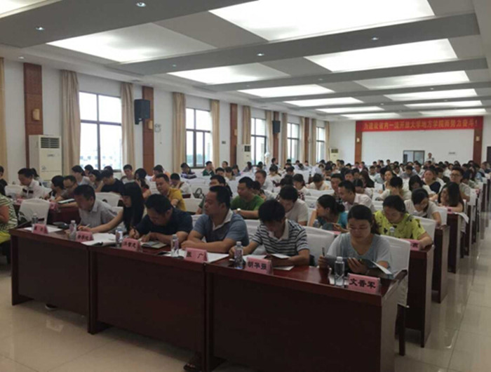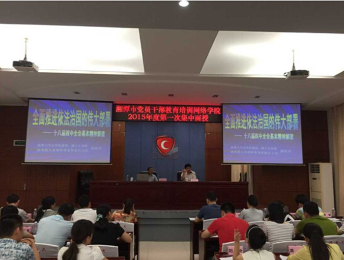 为深入学习贯彻党的十八届四中全会精神,正确把握当前形势,严格遵守党规党纪,推进依法行政,提高党员干部法治思维能力,湘潭市党员干部教育培训网络学院采取集中学习,通过举办现场专题讲座和远程授课形式,于2015年6月1日在湘潭电大实训楼六楼报告厅,对纳入湘潭市党员干部教育培训网络学院2015年度考试考核管理的约1000名学员进行为期10天的集中面授培训,这次培训共分五期,每期约200人。