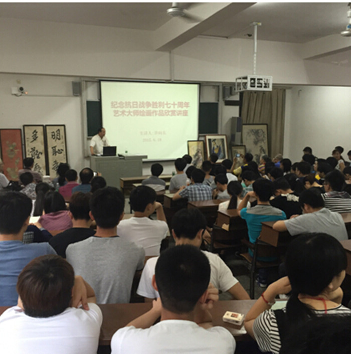 为纪念抗日战争胜利七十周年,弘扬伟大的抗战精神。6月18日,信息工程系和商贸旅游系共同邀请学校著名艺术品鉴赏专家许向东老师给14级学生进行了一次艺术大师作品欣赏讲座。许向东老师带大家一起赏析了高奇峰的《双鹰惊觉图》、于非闇的《鹦鹉不屈图》、徐悲鸿的行书《明耻教战多难兴邦》、林风眠的《仕女伤国图》、张大千的《喜浪摇荷图》和梅兰芳的《花卉博古图》等抗战时期的艺术作品真迹。对作品的创作动机、时代背景及作品所反映出的中华民族坚强不屈的民族精神和爱国激情,进行了精准独特的分析讲解,使同学们开阔了眼界,引起了思考,深受感染和教育。