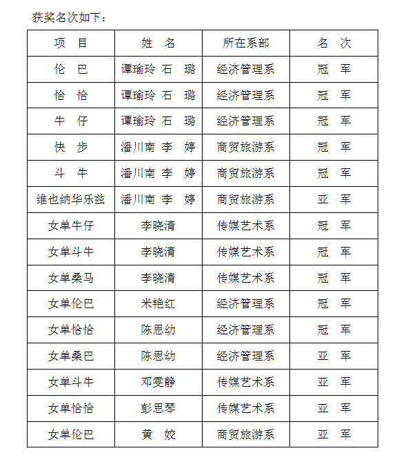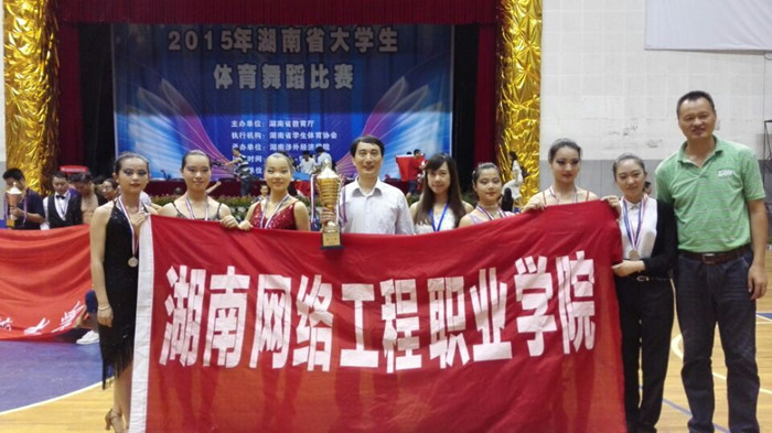 7月5日,由湖南省教育厅主办的2015年湖南省大学生体育舞蹈比赛在湖南涉外经济学院体育馆闭幕。我校代表队与其他兄弟院校代表队同台竞艺,克服了零场次竞艺经验等困难,不畏强手,勇于拼搏,最终夺得十金五银,团体总分第一的优异成绩。(文/图 伍娟/曾伟)