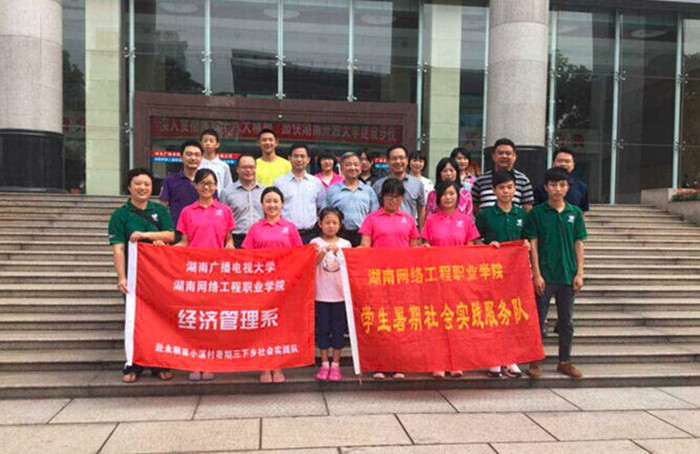 7月15日上午,湖南网络工程职业学院校团委、经济管理系在远教楼前坪举行“2015年大学生暑期“三下乡”社会实践活动出征授旗仪式”。校党委周宇副书记、吴敏副校长出席仪式,参加仪式的还有网络职院陈碧华副院长、校团委李涌涛书记、保卫处肖胜旗副处长、公共课部曾伟主任、经管系陈晓斌主任、招生就业办何海主任及经管系彭晔老师、社会实践小组全体学生,仪式由经管系副主任邓恩主持。