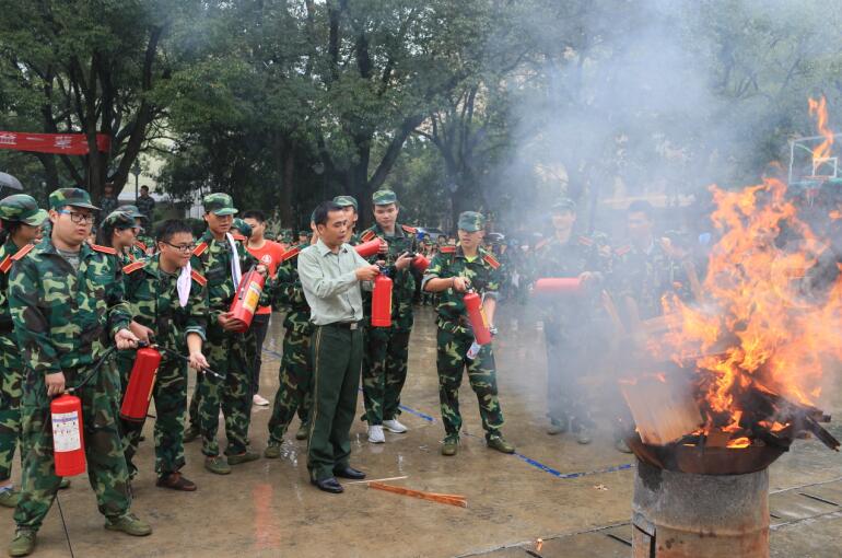 在学校篮球场,在保卫处消防干事和消防教官的带领下,学生代表们使用灭火器进行了灭火实际操作,引发了同学们的极大兴趣。