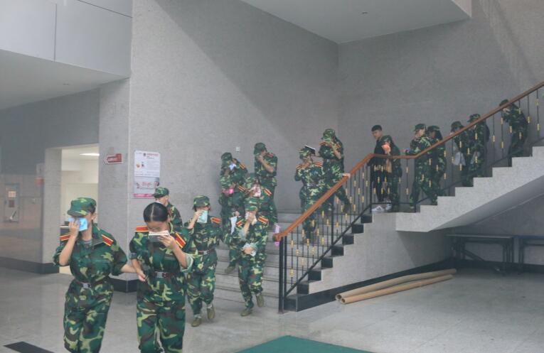 讲座结束后,在学生公寓六栋内教官燃放事先准备好的烟幕弹,模拟公寓起火场景,公寓内的新生按照消防教官教授的方法,纷纷拿出湿毛巾掩住口鼻,在老师的引导下快速从公寓内撤出。同时,消防车赶到现场,消防队员利用水枪对公寓进行模拟灭火演练,整个过程有条不紊,安全有序。