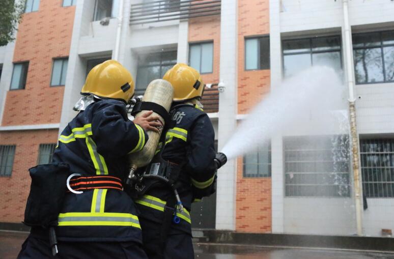 消防队员利用水枪对公寓进行模拟灭火演练