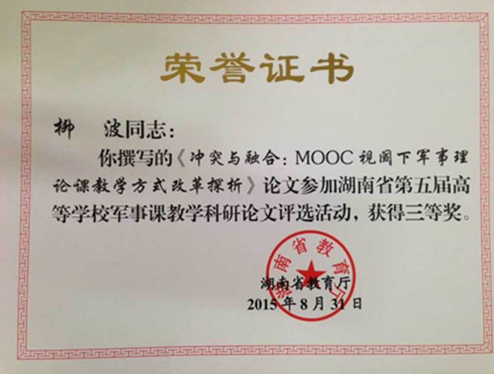 由湖南省教育厅、湖南省军区司令部主办的湖南省第五届高等学校军事理论课教学科研讨论会和国防教育工作年会日前在湘潭召开,全省100多所高校的武装部长参加会议。我校柳波老师撰写的论文《冲突与融合:MOOC视阈下军事理论课教学方式改革探析》一文获得三等奖。全省100多所高校共有47名老师的论文获奖。