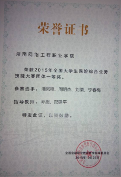 2015年10月24日-26日,由全国金融职业教育教学指导委员会主办,西安欧亚学院承办的“2015年全国大学生保险综合业务技能大赛”在陕西西安举行,此次大赛共有来自北京、广东、浙江、湖南等25个省市40支代表队,160名学生参赛。我院经管系金融管理与实务专业选拔潘岚艳、刘粟、宁春梅、周明杰等四名学生组队参赛,经过激励角逐,荣获总决赛团体一等奖,个人项目竞赛喜获一等奖一项、个人二等奖三项,为学院争得了荣誉。