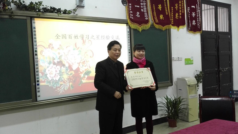 经验交流活动由雨湖区教育局局长谭先玉主持。湘潭电大党委副书记谭剑林宣读了中国成人教育协会[2015]045号文件“关于确定2015年‘百姓学习之星’的通知”,市教育局副局长伍国强向荣获2015年 “百姓学习之星”称号的风车坪学校副校长陈莹颁发了荣誉证书。