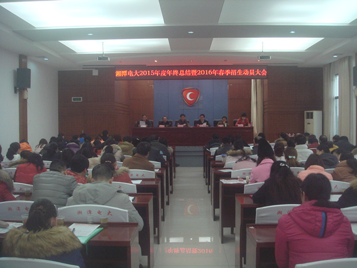 在会上,校长伍浩作了湘潭电大2015年度年终工作总结暨2016年春季招生动员报告。他全面总结了2015年度学校工作的主要做法和成效,并对2016年的主要工作作了部署:一是进一步加大招生力度,稳定办学规模;二是进一步加快信息化建设,提高应用水平;三是进一步加强队伍建设,深化内涵发展;四是进一步开展社区教育活动,推进终身教育;五是进一步巩固办学成果,抓好党员干部网络教育;六是进一步加强项目建设,打造继教品牌;七是进一步加强内部管理,规范办学行为;八是进一步加强安全工作,维护学校稳定。