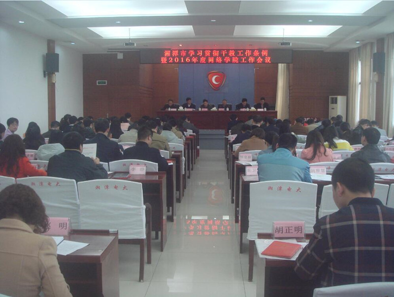 市党员干部网络学院办公室主任、湘潭电大党委副书记纪委书记谭剑林主持会议。市党员干部网络学院办公室副主任、市委组织部干教科科长朱艳璋组织与会人员学习了中央《干部教育培训工作条例》。市党员干部网络学院副院长、湘潭电大校长伍浩宣布了2015年度表彰通报,市党员干部网络学院院长、湘潭电大党委书记易建辉作2015年度工作报告,市党员干部网络学院副院长、湘潭市委组织部副部长李爱阳和湖南广播电视大学副校长陈明文分别作了重要讲话。