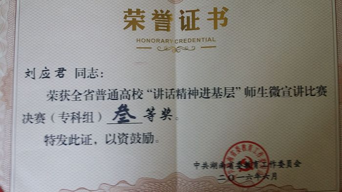 我校教师刘应君在全省普通高校“习近平讲话精神进基层”微宣讲竞赛中获奖