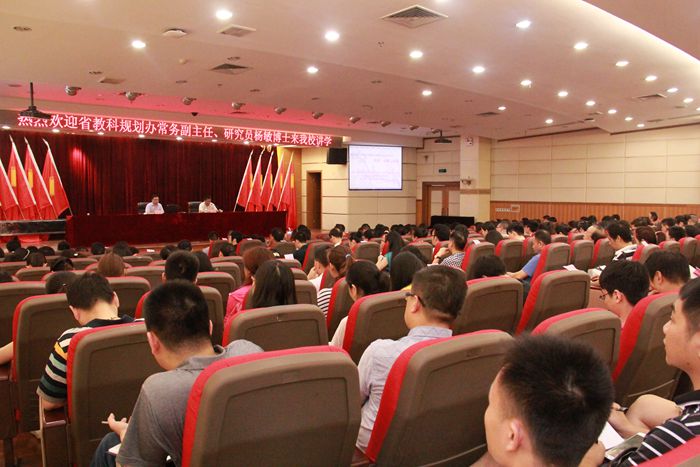 为进一步提升我校教师教学科研能力,让大家更多更好地了解、掌握教育科学规划类课题选题、申报和研究的规范程序、要求与技巧,提高课题研究质量和效益,科研处特邀湖南省教育科学规划领导小组办公室常务副主任、省教育科学院规划所所长、研究员杨敏博士,于6月21日下午来校举行了“教育研究课题申报的方法与技巧:选题、命题与论题”专题讲座。讲座由正校级督导刘演林主持,副校长方林佑和全校教师、科研人员及分校教师代表近300人参加了本次报告会。