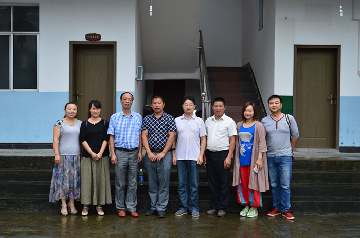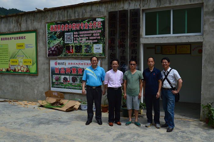 2016年6月1日怀化电大党委书记王安金(右2)和通道县委党校(教学点)校长左湘明(左2)在通道黑老虎中药材专业合作社考察时与合作社理事长杨昌宏合影