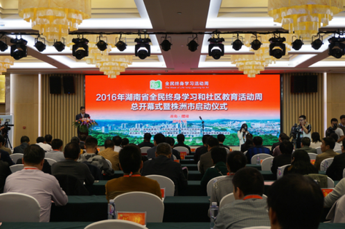 2016年湖南省全民终身学习和社区教育活动周总开幕式暨株洲市启动仪式10月25日在株洲醴陵市隆重举行。本届活动周以“推进全民继续教育,建设学习型社会”为主题,由湖南省教育厅、中共株洲市委、株洲市人民政府主办,株洲市教育局、中共醴陵市委、醴陵市人民政府、湖南省终身教育促进会承办。省政协副主席刘晓、老领导、省终身教育促进会会长唐之享、中国成人教育协会常务副会长张昭文、省人民政府副秘书长陈小春、省教育厅副厅长应若平、湖南电大党委书记陈建民等领导出席开幕式。来自中国成人教育协会、省政府办公厅、省教育厅、省电大、省终身教育促进会等相关部门负责同志,各市州教育局分管职成教育工作的副局长、职成科(处)长,各市州电大的负责人,国家和省级社区教育实验区、示范区代表、获全国“百姓学习之星”和 “终身学习品牌项目”的代表,株洲市10个县市区党政负责同志,株洲市级有关部门负责同志,醴陵市委、市人大、市政府、市政协有关负责同志以及新闻媒体的朋友们等领导、代表和嘉宾参加开幕式。开幕式由陈建民主持,省政协副主席刘晓宣布2016年湖南省全民终身学习和社区教育活动周暨株洲市启动仪式正式启动。中共株洲市委副书记雷绍业、中共醴陵市市委副书记市长康月林致辞。