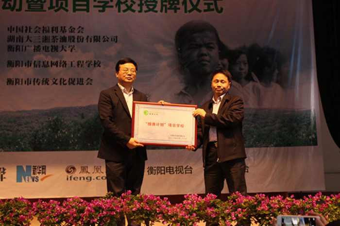 10月26日下午,由中国社会福利基金会、湖南大三湘油茶股份有限公司、衡阳市广播电视大学主办,衡阳市信息网络工程学校承办,衡阳市传统文化促进会协办的“授渔计划携手大三湘精准扶贫助学行动暨项目学校授牌仪式”在衡阳广播电视大学隆重举行。中国社会福利基金会授渔计划秘书长高继辉、湖南省民政厅老区办主任吴跃进、衡阳市教育局党委书记、局长周法清、湖南大三湘油茶股份有限公司董事长周新平、衡阳广播电视大学校长萧烽、衡阳市传统文化促进会秘书长宾洪志及衡阳电大全体师生参加了授牌仪式。仪式由衡阳电大副校长肖海源主持。