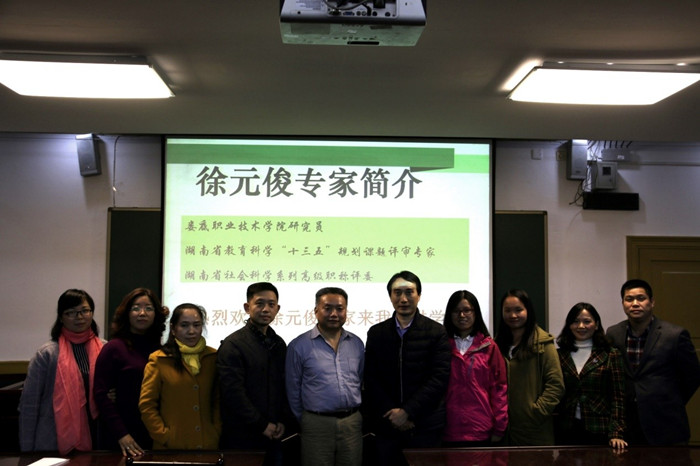 2016年11月3日,娄底职业技术学院研究员,湖南省教学科学“十三五”规划课题评审专家,湖南省社会科学系列高级职称评委,徐元俊教授在我院230教室进行了题为《教育科研课题的申报技巧》的精彩讲座,本次讲座由公共课教学部主任曾伟主持。教学部全体教师及部分兄弟部门老师一起参加了此次讲座。