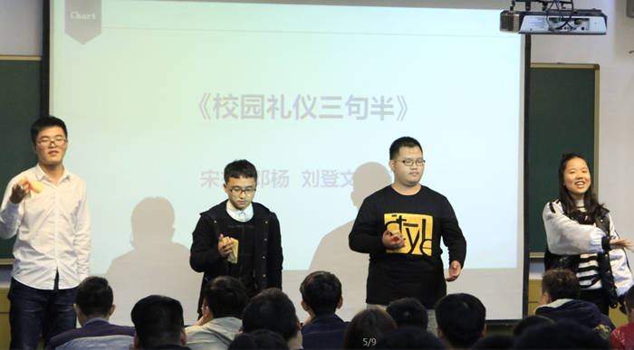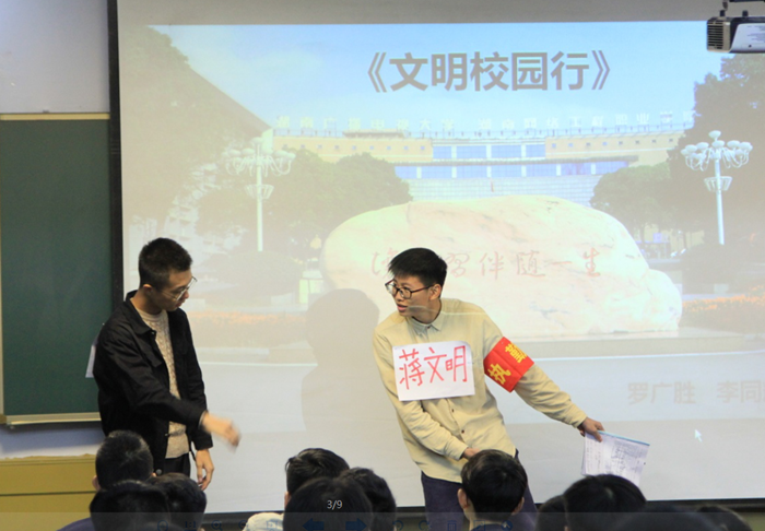 主题班会以一份网络问卷调查的形式开始,就网院在校学生最不能忍受的不文明行为以及学生对自己行为的评价调查进行了分析,学生们纷纷举手发言表达自己对产生这些行为的原因的看法。紧接着同学们围绕“创文明高校,做合格大学生”这一主题,以演讲、小品、朗诵和三句半等精彩纷呈的节目来揭示文明的内涵。最后,16级软件技术1班班长蒋佳君与各班的团支委、班干部发出倡议,为主题班会的活动划上一个圆满的句号。