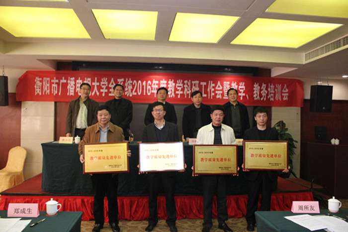 会上,龙永保首先传达了日前在杭州召开的2016年国家开放大学教学工作会议的精神,介绍了国家开放大学校长杨志坚关于机遇与挑战、安身立命之说和全面深化教育改革的主题讲话。衡阳电大教务处主任费少忠宣读了衡阳电大《关于表彰2016年度教学质量先进单位及教学、教务工作先进个人的决定》和《关于表彰全省电大15-16年度学习支持服务于教学资源配置先进分校、先进站点及先进个人的通报》。其后,费少忠分别做了《衡阳电大2015年度教学质量评价通报》和《衡阳电大2015年度教学科研工作报告》两个主题报告,就教学支持服务、论文教学、上期考试组织及通过率、衡阳电大及各教学点在籍与毕业学生情况做了报告,并回顾了衡阳电大一年来的教学科研工作,提出了下一年度的任务和目标。