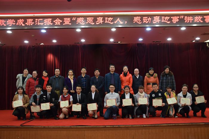 为深入学习贯彻习近平总书记在全国高校思想政治工作会议上的讲话精神,深入推进“两学一做”学习教育活动,为学生的成长成才成功奠定科学的思想基础, 进一步丰富思想政治理论课实践教学形式,全面提质提档思想政治理论课教学,12月20日晚,我校在远教楼负一楼报告厅举办了思政课实践教学成果汇报会暨 “感恩身边人,感动身边事“讲故事总决赛。副校长邓楠及相关部门的负责人与专业教师参加了活动并担任评委。全校350余名师生现场观看比赛。