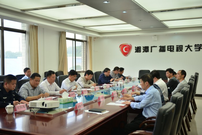 2017年4月19日下午,湘潭市委常委、政法委书记戴德清率公安、城管、教育等部门来湘潭电大调研指导工作。湘潭电大校长伍浩,主持党委工作的党委副书记、纪委书记谭剑林,党委委员、工会主席鄢小平分别介绍了湘潭电大近年来改革发展建设的情况,重点就校园综合治理和校园周边环境治理的情况进行了汇报。