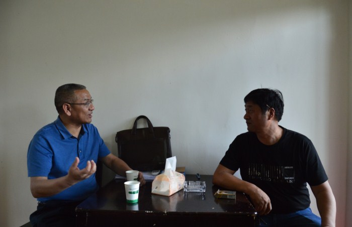 怀化电大校长邓安生(左一)与芙蓉溪村村主任杨宏喜交谈