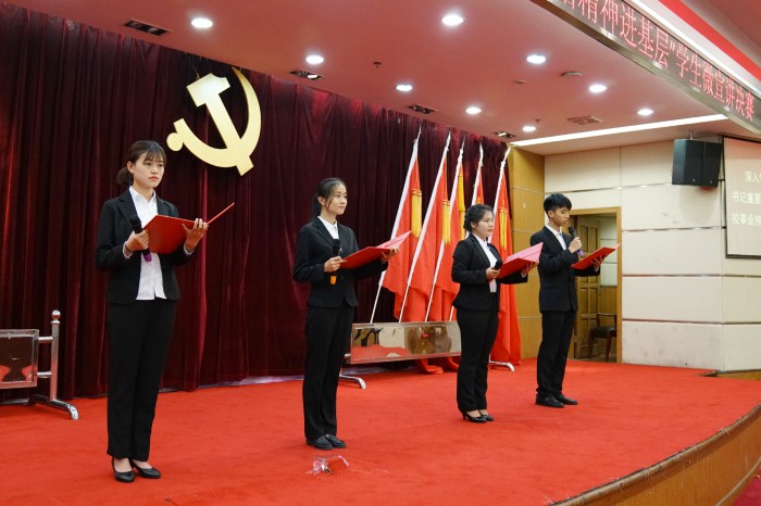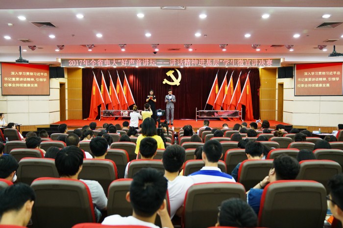 为推动全系统党员师生学习贯彻习近平总书记系列重要讲话精神、贯彻落实全国高校思想政治工作会议精神、创新“两学一做”学习教育载体,从4月中旬开始,我校举行了2017年度全省电大“好声音讲坛——讲话精神进基层”师生微宣讲比赛活动。5月10日晚18时30分,学校“好声音讲坛--讲话精神进基层” 微宣讲校本部学生组决赛在远教楼负一楼学术报告厅举行。当天共有来自网院五系预赛选拔出来的十七组选手参加比赛。