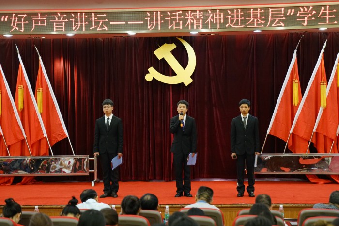 宣讲比赛在《重温讲话 贯彻精神》的朗诵节目中拉开序幕。十七组参赛选手们结合自身学习、生活实际,从讲话精神的意义、内涵、实质、实践等方面展开了宣讲,体现较高的思想政治觉悟与学术价值。经过两个半小时如火如荼的激烈竞争,最终机电工程系推荐作品——《我们的中国梦》通过舞台情景剧的形式,将讲话精神与校园真实生活相结合,寓情于景,其凸显出来的生活感、真实感赢得了在场评委与观众的一致好评,获得排名第一的好成绩;由学校推荐作品——《全面建设小康社会路上的科技创新》成绩排名第二,其全新的科技视角、流畅的语言表达、清新的舞台风格为作品加分不少;网络资源系推荐作品——《中国有梦 青春无悔》以凝练简洁的语言文字、刚劲有力的肢体表达给人耳目一新的精神洗礼,成绩排名第三。