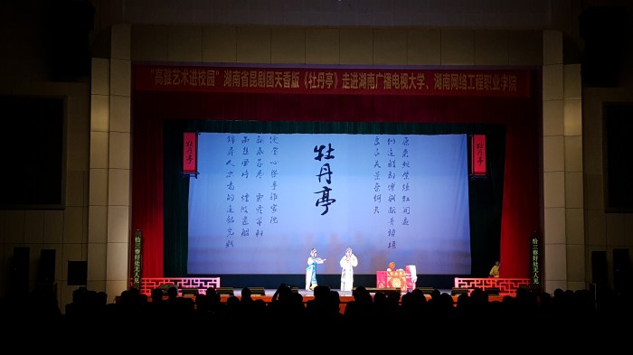 5月21日晚,“高雅艺术进校园”湖南省昆剧团天香版《牡丹亭》在我校体育艺术馆演出,校领导周宇、刘建军、刘演林,老领导曹利君、彭思毛、高宁等出席活动,学校师生、教师家属、长沙兄弟院校师生代表、全国剧迷等600余人观看了演出。本次演出是湖南省昆剧团继5月19日晚在中南林业科技大学首场演出后,在长沙高校的第二场,是省委宣传部和省教育厅“雅韵三湘”高雅艺术普及计划活动的一部分。