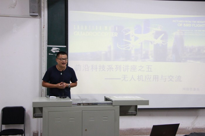5月16日晚,无人机应用交流讲座在教学楼330教室开始,现场座无虚席。讲座内容涵盖无人机发展、无人机行业应用、高清航拍作品欣赏、你问我答、现场抽奖等环节。同学们通过前面两天的试飞,对无人机充满了无限遐想,带着疑问认真听取了讲座,并向企业方代表询问了很多与专业相关的问题。