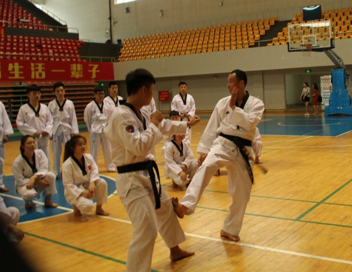 本场竞赛选手为陈晓华、邱颖俊、郭贤锋,课堂教学竞赛以20分钟的微课程形式进行。按照抽签顺序依次为陈晓华的《篮球综合投篮练习》、邱颖俊的《拉丁舞的侧行走--慢、快步》、郭贤锋的《跆拳道正踢腿》,三位教师授课教学特色明显、师生互动活跃、创新点突出,赢得了现场观摩教师与学生的阵阵掌声。