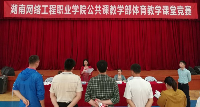 6月6日下午,公共课教学部首届教师课堂教学竞赛最后一场体育组教学竞赛在体育艺术馆进行,由副校长邓楠、网院副院长陈碧华、网院教务处长欧阳文萍、网院教务处副处长张小燕担任本场比赛评委。竞赛由教学部主任曾伟主持。