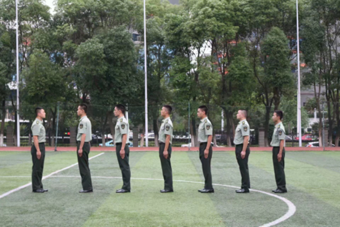 座谈会后,长沙师范学院一行参观了我校监控系统、军事后勤保障。之后在学校田径场现场观摩了李志龙老师带领的校卫队“四会”教官现场教学展示和集训。校卫队“四会”教官现场展示了单个军人队列动作、军训口号、“四会教学”理论讲解、分列式教学、擒敌拳表演、女子匕首操表演、倒功表演等,受到长沙师范学院一行的高度评价,他们现场向校卫队干部和“四会”教官代表询问了自训教官的学习、训练、淘汰等程序和学生自我管理、自我服务的经验。