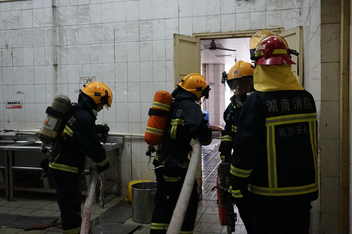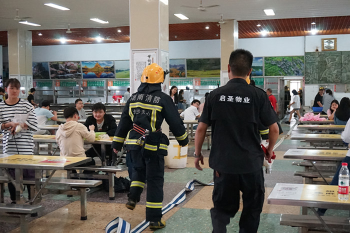 为进一步做好夏季消防安全工作,提高应对火灾的处置能力,确保校园消防安全形势持续稳定。6月15日上午,天心区消防大队罗家坡中队的消防官兵针对我校消防重点部位火情处置及防范开展消防实战演练,保卫处、启圣物业保安与食堂工作人员共同参与了消防演练。
