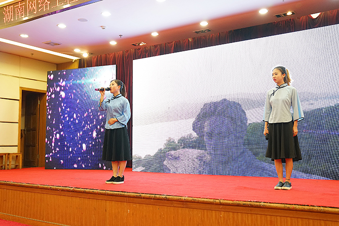 谢伦浩为本场比赛点评,他首先惊叹于网院学子的音色、激情和努力,随后指出朗诵是艺术,也是技术,艺术需要天资具备,而技术需要后天习得。他希望同学们能通过更系统的学习,携朗诵技艺和风采走出网院,走出湖南。最后,整场比赛在谢伦浩精彩的诗朗诵《沁园春·长沙》中结束。(图/党委宣传统战部 文/旅游管理系)