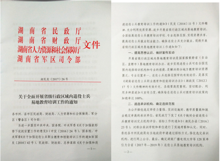 近日,省民政厅、省财政厅、省人力资源和社会保障厅及省军区司令部联合发文,确定湖南广播电视大学等128家单位为湖南省(2017年——2019年)退役士兵易地教育培训定点机构。该项目由湖南省民政厅牵头,旨在充分利用优质资源,逐步开展省级行政区域内易地教育培训,全面拓展退役士兵教育培训学校、专业选择范围,实现资源共享,提高退役士兵就业创业能力,确保退役士兵充分就业。